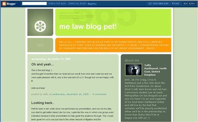 Next academic year all students will be encouraged to keep a blog. It is hoped that our students will maintain their blogs throughout the LLB programme, acting as a constant tool for reflective practice, but for there to be a real incentive other modules will need to utilise blogging. It is intended that one additional module in 2006-07 will utilise blogging, allowing students in the current first year to maintain their blogs.