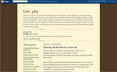 The software chosen for the student blogs was Blogger. Blogger has a terrific online support mechanism, and crucially was the most user friendly software we found. It allows a blog to be quickly and easily established for technophobes, but also has the flexibility to allow for more complex use amongst the technically proficient, from the incorporation of online opinion polls and ‘hit’ counters through to RSS feeds and beyond. The site takes a would-be blogger through each stage, removing the need for one to one supervision in the setting up of a blog. Nonetheless, I offered a workshop to talk students through setting a blog up.