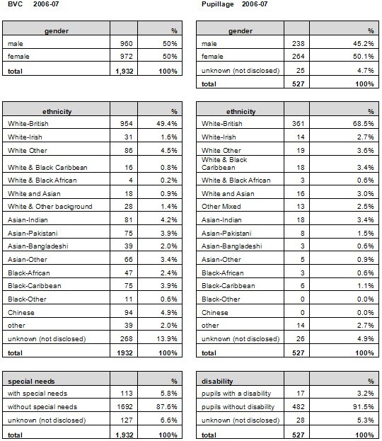 Analysis by gender, ethnicity and special needs/disability is also significant – see the tables below for 2006-07, the last year for which full information is available: