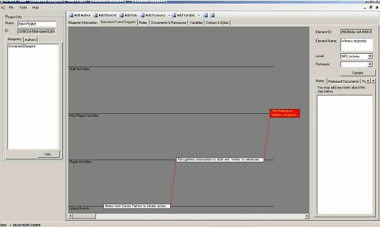 The core concept of the NED is based on the notion of activities taking place involving different entities (both Player Characters and Non Player Characters) generating a message (some information) which is then passed on to another entity (again either Player Characters or Non Player Characters). Activities are placed on a line representing the scope of the entity – for example, tasks that students perform are placed on the Player Character line.