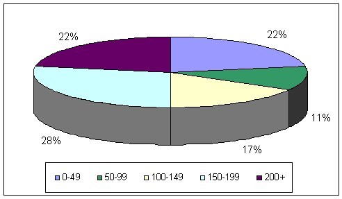 We have grouped the student numbers in bands of 50 for ease of reference. Whilst there appears to be a more or less even spread between categories, the 150-199 band is clearly the biggest. If we label anything over 100 students as ‘large’ then it can be seen that 67% of the modules contained a ‘large’ number of students, thus demonstrating that student numbers do not seem to deter the use of mooting within the curriculum. This will be explored in greater depth during phase III.