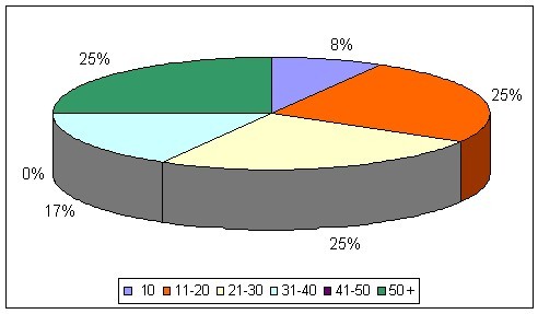 The results (next diagram) demonstrate that the results were fairly equivocal, but that the most popular grouping is between 10 and 30% of the overall assessment weight for the module. Where the module is assessed 100% by moot, this was in a discrete mooting module, but invariably a number of elements (not merely the oral performance) contributed to the assessment grade. Not every institution explained what those elements were. This will be explored during phase III.