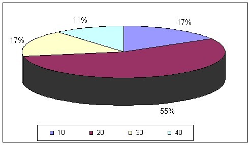 The results (next diagram) demonstrate that the results were fairly equivocal, but that the most popular grouping is between 10 and 30% of the overall assessment weight for the module. Where the module is assessed 100% by moot, this was in a discrete mooting module, but invariably a number of elements (not merely the oral performance) contributed to the assessment grade. Not every institution explained what those elements were. This will be explored during phase III.